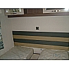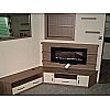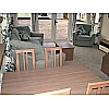 The Ontario walnut kitchen with its island drawer unit features a large integrated fridge freezer, high level oven and grill with freestanding dining table and upholstered designer chairs. The walnut finish continues into the living room with its contemporary furniture and soft furnishings.
