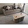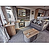 The bright, airy living area provides a cosy yet spacious retreat with a freestanding two-piece suite, including fold-out occasional bed and scatter cushions, framed fireplace with 'Bach' electric fire, and a sleek coffee table with two upholstered stools underneath. There’s a TV point with Co-Ax and 240V socket for relaxing evenings in, and a large mirror and modern framed wall picture add extra flair.