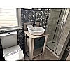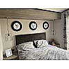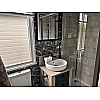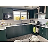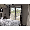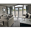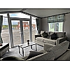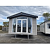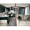 Modern open plan living space with a boutique sense of luxury. Large kitchen with great features. Natural light fills the living space through the front French doors and apex glazing helping to create a great family space, with free standing sofas and modern TV cabinet and coffee tables, finished with an industrial design. The remote-controlled electric fireplace provides a great focal point perfect for cosy evenings in. Stylish yet function kitchen space, with sleek contemporary doors finished in an elegant green with gold handles. The integrated appliances and one and a half bowl Reginox caststone sink add to the design keeping everything uniformed. Mealtimes can be enjoyed around the bespoke designed dining table with matching bench seating and feature pendant lighting. With a boutique feel the bathroom excels a boutique sense of luxury through the leaf print wall design features a large domestic shower with dual thermostatic shower including adjustable rainfall shower. The black accessories and warming wooden and green tones in the furniture add to the modern design. The full master en-suite design replicates the main bathroom, providing a sense of luxury throughout. The master bedroom features natural wooden tones combined a contemporary industrial design. Filled with natural light through the floor to ceiling double window and a functional dressing closet provides great storage and the full en suite continues the stylish design seen throughout. The additional bedrooms feature twin beds with built in storage and floor space. The Riverwood Lodge brings green tones into a modern living space. The bright and light open plan living space is enhanced by the green colour tones of the kitchen and the neutral colours across the dining and living furniture. Built to the great Victory standard with NoVus technology, you know you are buying the best. Take a step outside of the large aluminium clad holiday home and you’ll be equally impressed with the external design as you are the internal, with a feature focal roof overhang with LED aspect lighting to the front aspect of the leisure home.