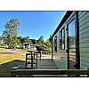 The Debonair interior is an epitome of country home living. The Lounge has free standing 2 and 3 seater settees with homely fabrics and contrasting stag and bolster cushions. The Living room also features a log-burner style electric fire in a traditional mantelpiece setting. The farmhouse style Kitchen is complimented by the dining furniture with matching chairs. The fully fitted Kitchen benefits from an integrated gas oven and 5 ring hob & an Integrated Fridge/Freezer. The kitchen units are a mixture of standard and glass fronted doors for an added touch of elegance. With a host of options added to this Model currently on show at Warren Forest Holiday Park near Harrogate, on a fantastic pitch, this really is worth a viewing as soon as possible.