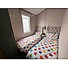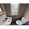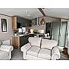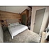 The Heritage 4 boasts an expansive and bright living space with 7ft side walls and feature aspect windows. The luxurious freestanding 2 and 3-seater sofas feature deep button arms, while the contemporary fire surround houses a log burner style fire cabinet. Adjacent to the living area, the dining space comprises a light wood freestanding table and four cream wood dining chairs. The open plan kitchen in the Heritage 4 is spacious and stylish with stunning willow green cabinets and stone-effect contrast tops. Standard features include an integrated oven and grill, extractor hood, fridge/freezer, and black composite sink with a mixer tap. Illustrated here in the 38ft x 12ft – 2 bedroom layout, the Atlas Heritage 4 showcases a standard matt finish châteaux grey cladding with Graphite PVC windows and doors The master bedroom in the Heritage 4 is generously proportioned and comes with a king size bed, deep buttoned headboard, and freestanding furniture in light wood with willow green fronts. The large dressing table features a tub style stool and circular mirror above. The main bathroom is equipped with a large shower cubicle, fitted cabinet with wooden splash-back, counter top basin, and WC. All models in the Heritage 4 range feature an ensuite wash basin and WC in the master bedroom. With its versatility and spaciousness, the Heritage 4 is an ideal choice for those seeking a holiday home.