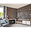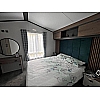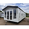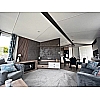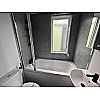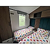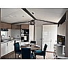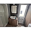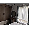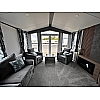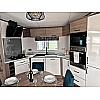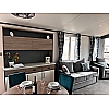 The Status 5 offers luxury open plan living space. With vertical blinds at the front offering shade, the lounge features large sofa with two swivel chairs in sumptuous velvet fabric with scatter cushions as standard. Fitted furniture and coffee table are in dark coloured oak-effect and the electric fire has a large mirror above.