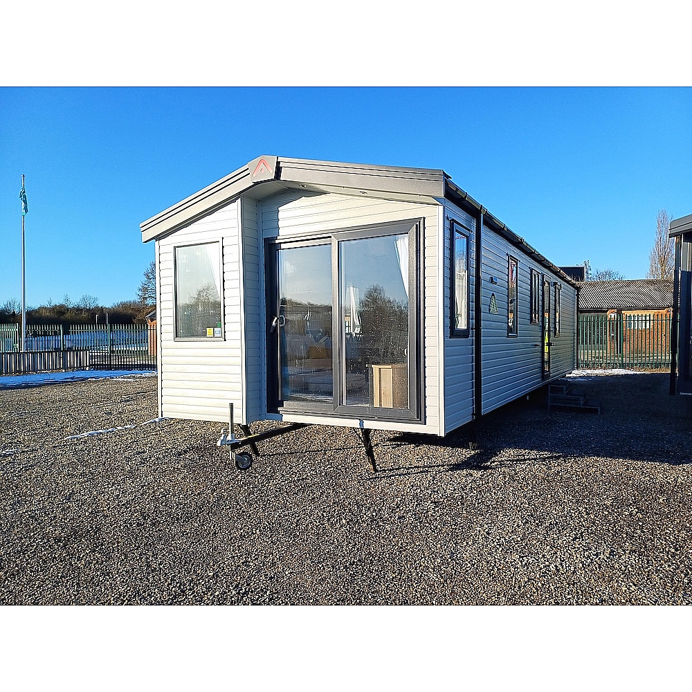 The Debonair 11 interior is an epitome of country home living. The lounge has freestanding 2 and 3 seater settees with homely fabrics and contrasting stag and bolster cushions. The lounge also features a log-burner style electric fire in a traditional mantelpiece setting. The farmhouse style dining table is complemented by matching chairs which continue the country theme. The Debonair 11 has a fully fitted farmhouse- style kitchen benefiting from an integrated oven and 5 ring gas hob, electric cooker hood and integrated fridge freezer. The kitchen units are a mixture of standard and glass fronted doors for an added touch of elegance. The Debonair here at Yorkshire Holiday Homes is the 36ft x 12ft. It has 2 bedrooms with light grey aluminium cladding and PVC windows and doors finished in white. Model illustrated also includes the optional sliding patio door. The Debonair 11 master bedroom continues the traditional styling with beautiful built in furniture and kingsize bed. Light floods in to the bedroom through the large three- quarter height window and the bedroom is completed with ensuite comprising wash basin and WC. The second bedroom in the Debonair 11 features two single beds and a built in wardrobe with overbed storage. There is also a 3 bedroom model available giving extra sleeping options. The main shower room has a large shower cubicle, stylish countertop wash basin with storage cabinet below, WC and external extractor fan. The ensuite to the master bedroom has a wash basin with mirror above and WC. Due to its great popularity, there are now 7 variations of the Debonair 11 available. The 12ft and 13ft widths come in lengths between 36ft to 40ft including two exciting new twin shower configurations. We have 3 models to view here at Yorkshire Holiday Homes, so call in Monday to Friday or ring us for a weekend appointment, as we only open at weekends for appointments only. 01937 849128