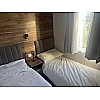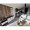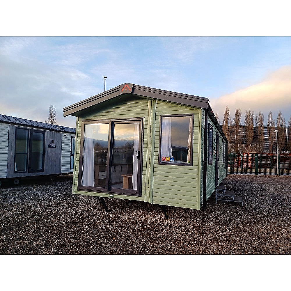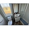 The signature feature of the Sahara 4 is the textured wood finish with pewter fleck throughout. The lounge area has soft L-shaped seating with separate cushions, a striking TV cabinet with housing for the optional modern electric fire and ample drawer, cupboard and shelf storage. The dining area has a freestanding table and 4 chairs with feature dinette lighting above. There is useful seating at the entrance with coat hooks above. The Sahara 4 kitchen features modern grey door fronts with a black composite sink and matching tap. The integrated electric oven with stainless steel gas hob has an extractor above. The kitchen is also equipped with 70/30 fridge freezer and space for microwave. The Sahara 4 we have here at YHH is the 36 x 12 – 2 bed. Finished in Enviro Green aluminium cladding, the model shown has graphite PVC windows and door and front sliding patio doors. Note: Dress kit is for display purposes only A large master bedroom with ensuite features in the Sahara 4. The kingsize bed with upholstered wall mounted headboard has fitted bedside cabinets either side and a dressing table with circular mirror above is twinned with a cube-style stool. The twin bedrooms in the Sahara 4 are very spacious with twin single beds. Wall mounted headboards, fitted wardrobes and centre bedside cabinet are also included as standard. The master bathroom features a large shower cubicle with WC and extractor fan along with a large vanity unit with ample storage and modern countertop wash basin. The ensuite bathroom to the master bedroom has washbasin and WC with useful full height storage cabinet in the 36ft and 38ft models. The 36x12 2 bedroom model is now available to view at Yorkshire Holiday Homes, Unit 154,Thorp Arch Estate, Wetherby LS23 7BJ