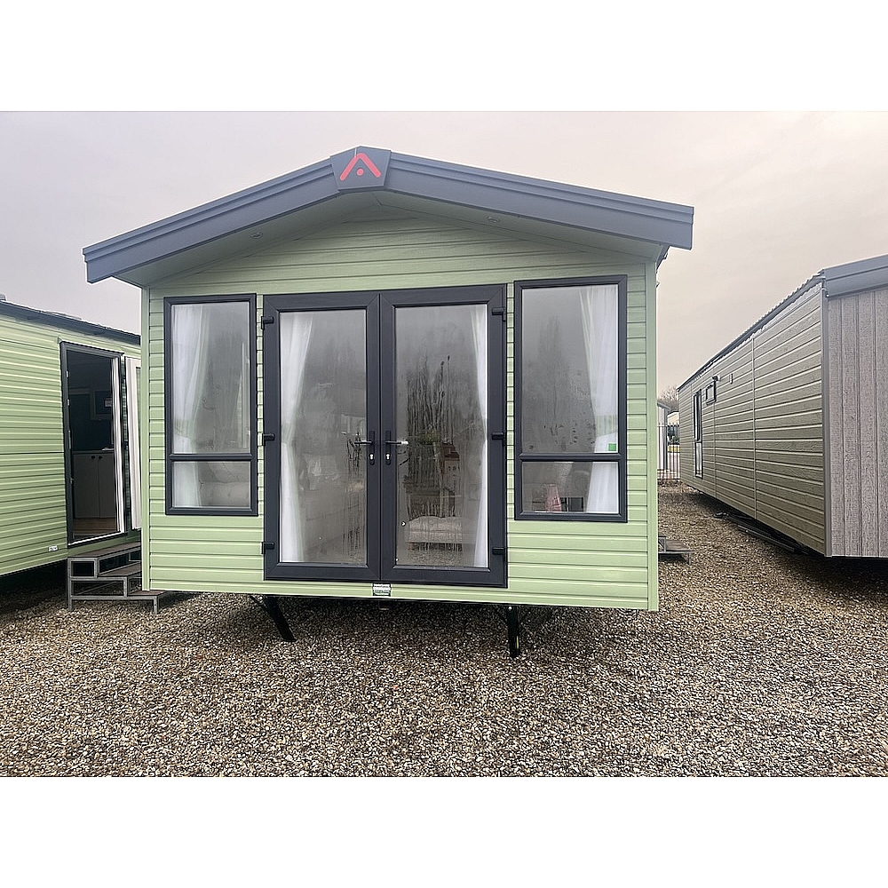 The dining area adjoining the kitchen has a light wood freestanding table with 4 cream wood dining chairs. The spacious open plan kitchen in the Heritage 6 features stunning willow green cabinets and stone-effect contrast tops. This model has an integrated oven and grill, extractor hood and fridge/freezer and black composite sink and mixer tap as standard. The Heritage 6 benefits from a large master bedroom with king size bed accompanied by a deep buttoned headboard and freestanding furniture in light wood with willow green fronts. The large dressing table comes complete with a tub style stool and circular mirror above. Now Available to View at Yorkshire Holiday Homes, Unit 154, Avenue A, Thorp Arch Estate, Wetherby LS23 7BJ. Weekend Viewings available by appointment Only